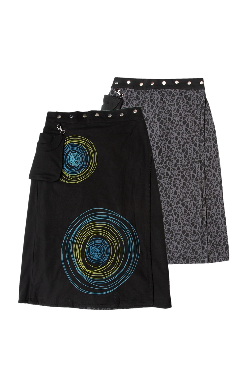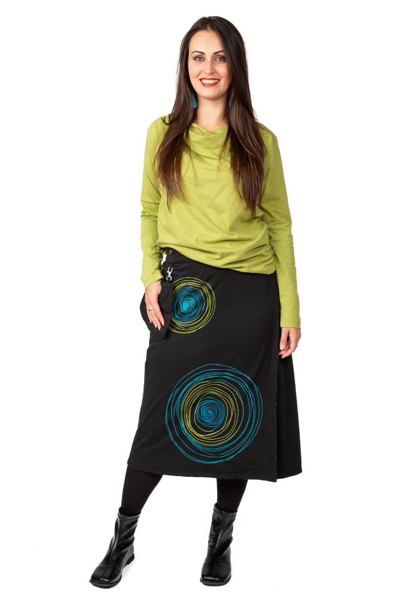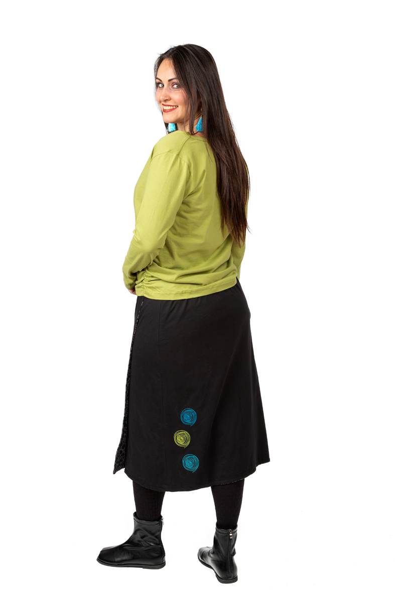 Bio & fair kommt er daher: der GliX Wenderock Open. Neu: jetzt auch wadenlang!  Größenverstellbar, Tasche abnehmbar und beidseitig tragbar. Große Kreise in frischen Farben auf der einen, dezente Ammoniten auf der anderen Seite.  2 in einem, wie man in der Werbung sagt 😉